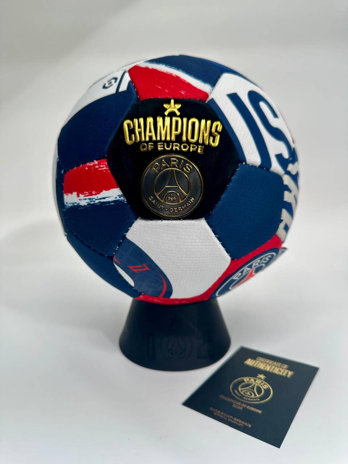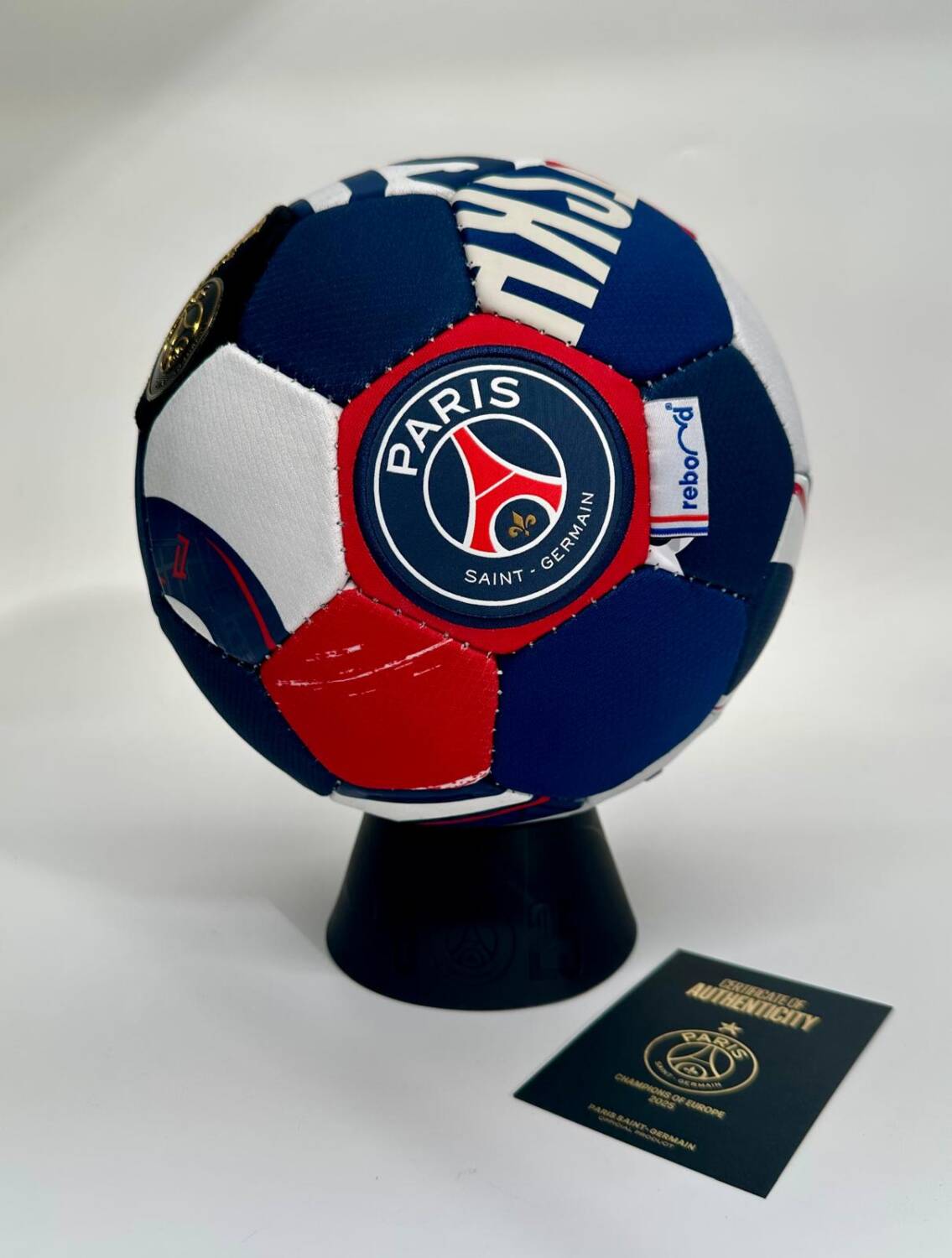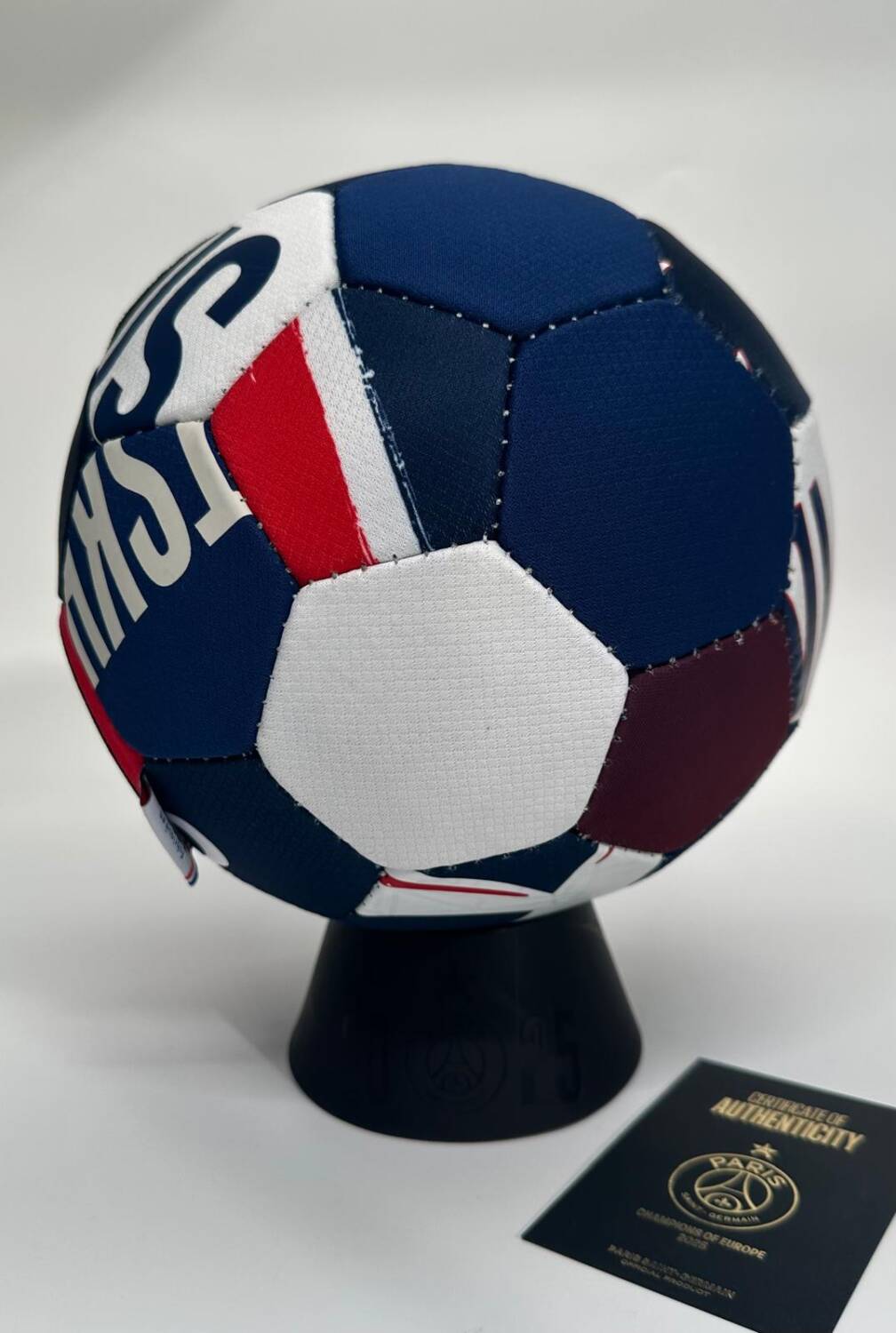 Issu d’un travail d’exception, ce ballon haut de gamme est réalisé à la main dans notre atelier de Gétigné, en Loire-Atlantique. Il s’agit d’un produit officiel Paris Saint-Germain, réalisé par nos soins à partir des véritables maillots officiels du Paris Saint-Germain – saison 2024-2025.
